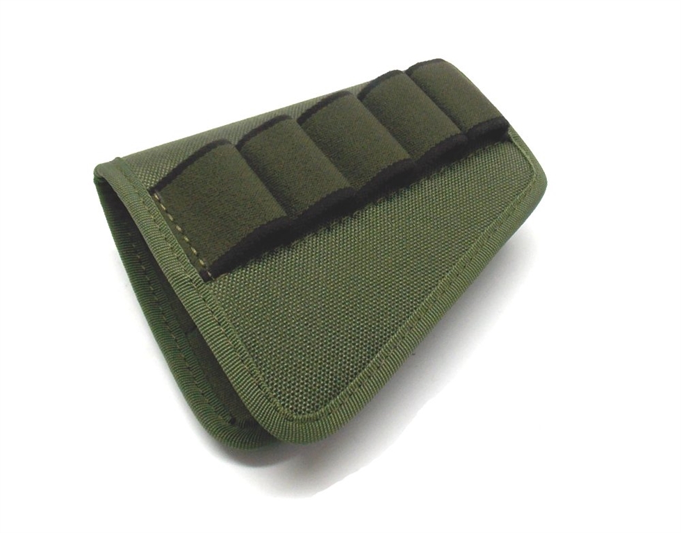Porta colpi in cordura da montare sul calcio del fucile. 5 posti per cartucce calibro 12, celle elastiche. Lunghezza lato dorso calcio :13 cm. Colori disponibili: nero o verde. Peso lordo: 55 grammi. Prodotto in Italia.