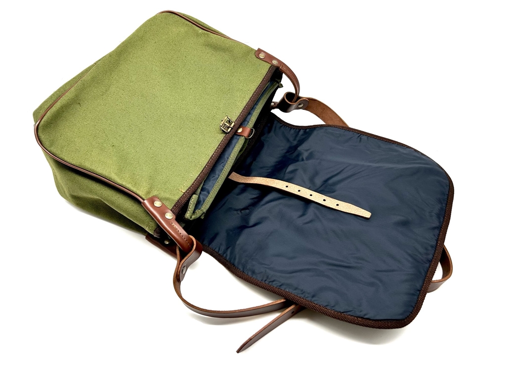 Lunghezza cm 27, larghezza cm 35, profondità cm 17,5. Doppio scomparto interno. L'interno è in nylon sfoderabile e lavabile. Tracolla in cuoio regolabile. Riporti in cuoio. Data la dimensione si presta per il trasporto di conigli. Peso lordo: 800 grammi. Prodotto in Italia.