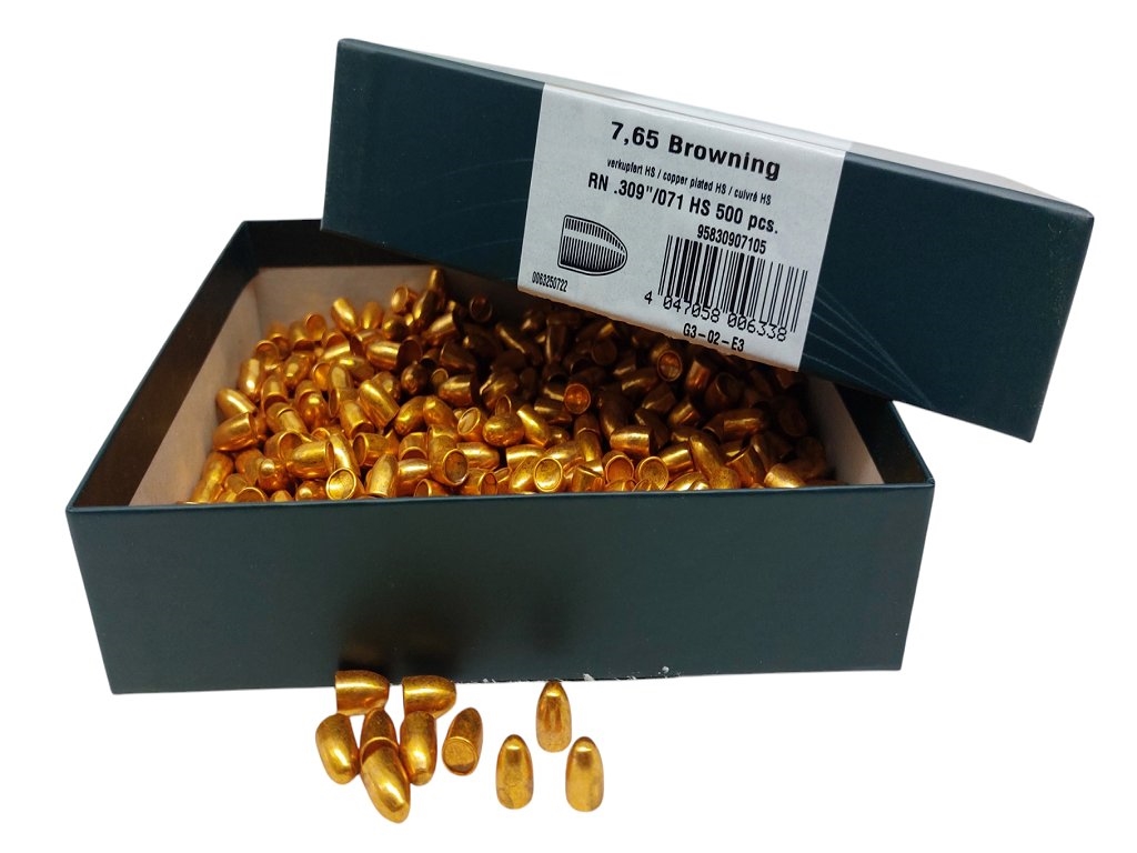 Palla H&N in piombo ramato ogivale calibro 7,65 browning rn, 71 grani, trafilatura .309/7,85 mm diametro, peso 4,60 grammi. Confezione 500 pezzi. Prodotto in Germania. Peso lordo: 2460 grammi.