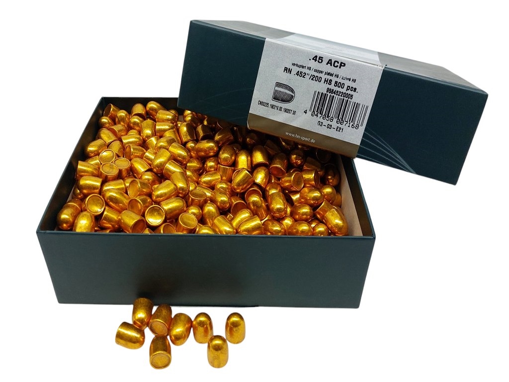 Palla H&N sport in piombo ramato ogivale calibro 45 acp 200 grani rn, trafilatura .452/11,48mm diametro, peso 12,96 grammi. Confezione 500 pezzi. Prodotto in Germania. Peso lordo: 6595 grammi.