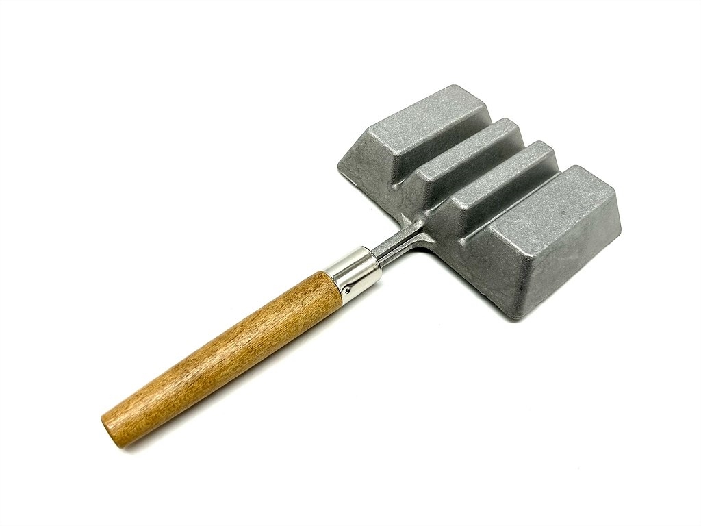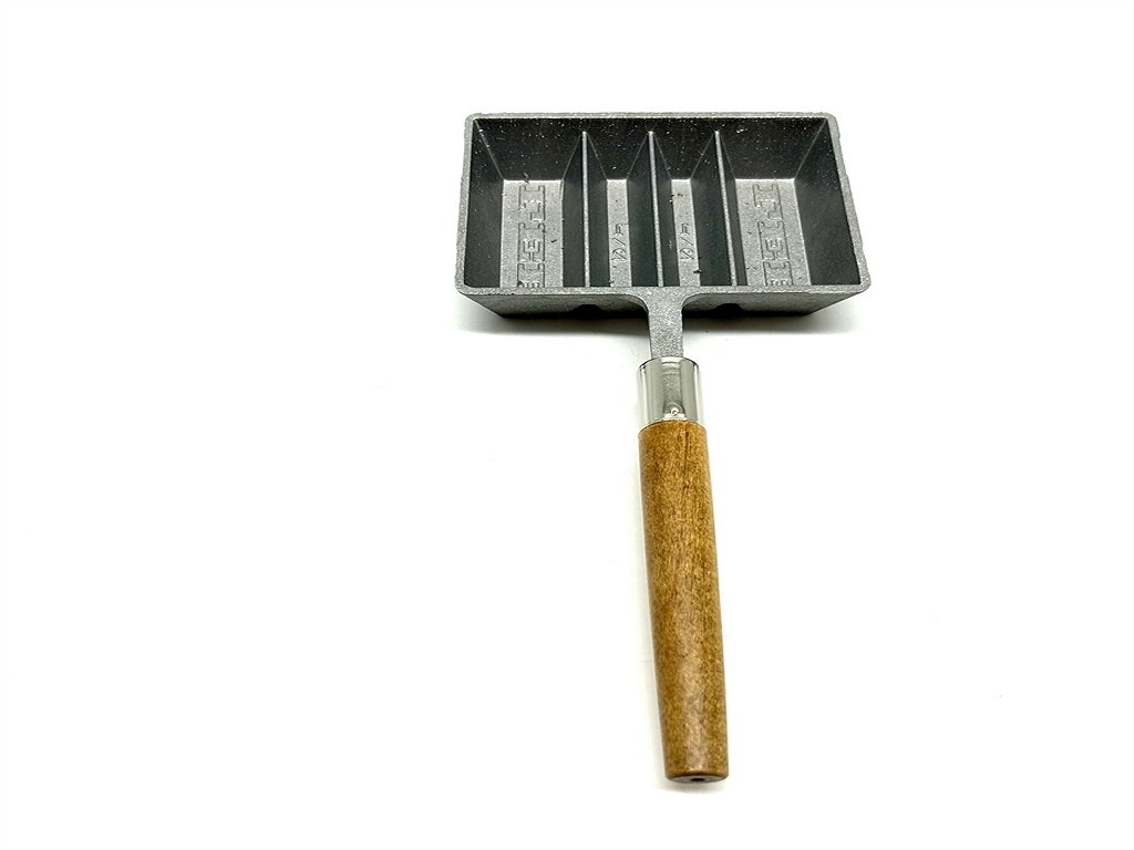 Ogni stampo forma quattro lingotti di due misure. I bordi dello stampo sono svasati per potere estrarre comodamente i lingotti. Manico in legno smontabile. Lunghezza con manico cm23. Dimensioni dello stampo: cm 12X8X3. Prodotto in Usa. Peso lordo: 230 grammi