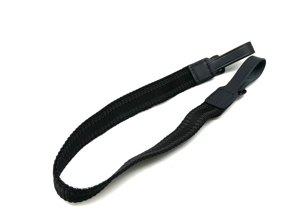 Bretella porta fucile in nastro elastico nero con antiscivolo e attacchi cuciti in cuoio nero. Lunghezza massima 74 cm con elastico a riposo. Larghezza 3 cm. Prodotto in Italia. Peso lordo: 70 grammi.