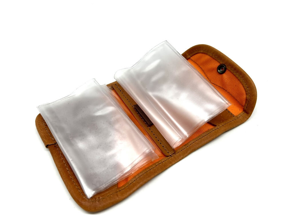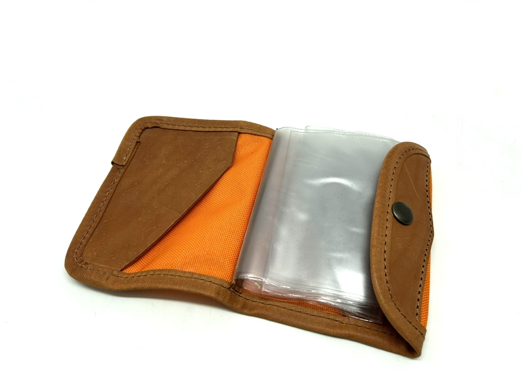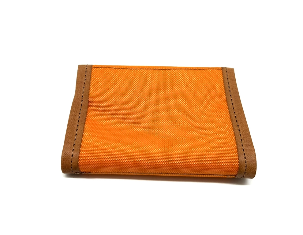 Porta licenza in cordura arancione con riporti in cuoio. Dimensione chiuso: 13,5x10 cm. Dotata internamente di finestre trasparenti e di due scomparti in cuoio. Chiusura con bottone a pressione. Prodotto fatto in Italia. Peso lordo: 90 grammi.