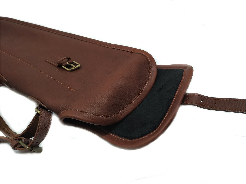 Porta fucile in pelle marrone per fucile smontato. Imbottito internamente in morbido orsetto nero. Dotato di bretella in pelle regolabile e maniglia per il trasporto. Lunghezza 82 cm, larghezza massima 20 cm. Prodotto in Italia. Peso lordo: 1350 grammi.