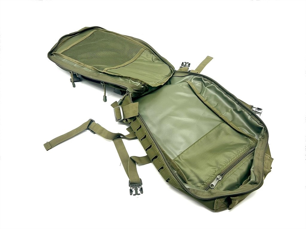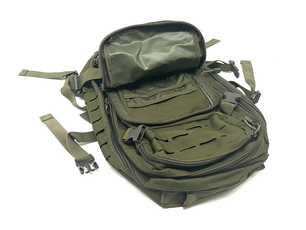 Zaino tattico realizzato in resistente nylon con doppie cuciture e con sistema molle con taglio eseguito al laser. Schienale imbottito e retinato per un confort ottimale. Dotato di due vani grandi con cerniera, sul davanti due tasche con cerniera, varie tasche interne. Maniglia per il trasporto, spallacci imbottiti e regolabili, cintura aggancio rapido, regolazioni laterali. Dimensioni: 45x22x13 cm. Peso lordo: 1160 grammi.