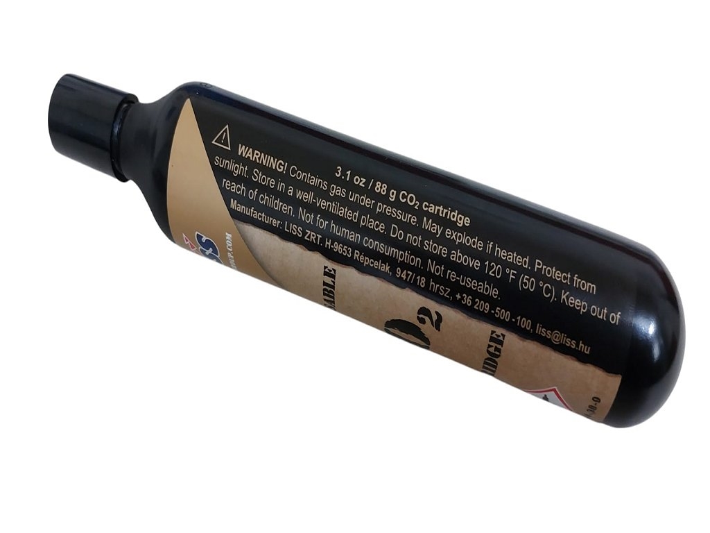 Bomboletta di anidride carbonica per ricaricare carabine Gamo. Non ricarica carabine Sig Sauer. Contenuto 88 grammi. Peso lordo: 365 grammi. Lunghezza totale della bomboletta 20 cm e diametro 3,5 cm.