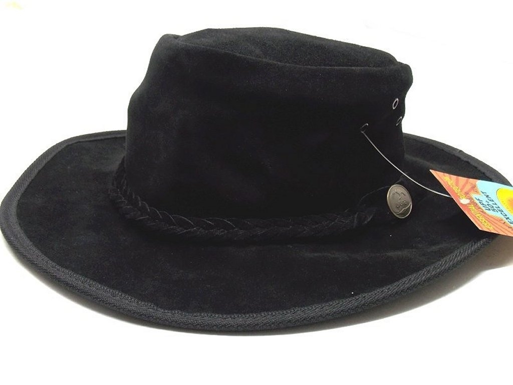 Cappello in pelle scamosciata nera resistente ai raggi ultravioletti. Con tre occhielli per parte per una maggiore traspirazione. Dotato di treccia decorativa in pelle. Misure disponibili dalla 56 alla 62. Peso lordo: 250 grammi. Prodotto originale australiano.