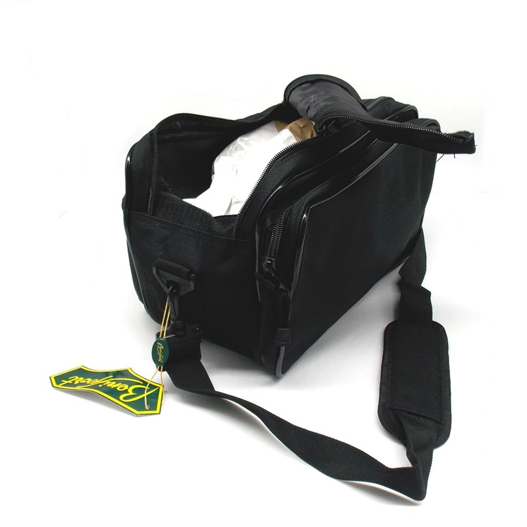Borsa da tiro in resistente poliestere. L'interno è foderato con tessuto stampato. Dotato di tracolla regolabile. Ampio vano centrale con cerniera. Due ampie tasche uno sul retro e una sul davanti. Misure: 34x20x24 cm. Colore nero. Peso lordo: 625 grammi.