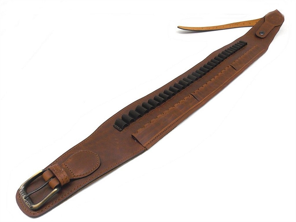 Cartuccera porta cartucce carabina in cuoio ingrassato marrone con celle elastiche e protezione palla. Lunghezza girovita massima 106 cm, larghezza massima 9,5 cm.Foderata internamente con pelle scamosciata.Fibbia in ottone.Prodotto in Italia. Peso lordo: 380 grammi.