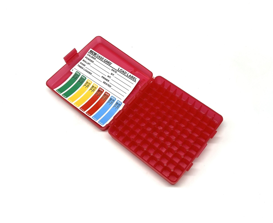 Scatola in plastica rossa MTM per 100 colpi. Adatto per i seguenti calibri: 9, 380, 32 sw, 30 luger o 7,65 parabellum. Dimensioni: h 3,5 cm, larghezza 12 cm e lunghezza 12 cm. Prodotto in Usa. Peso lordo: 110 grammi.