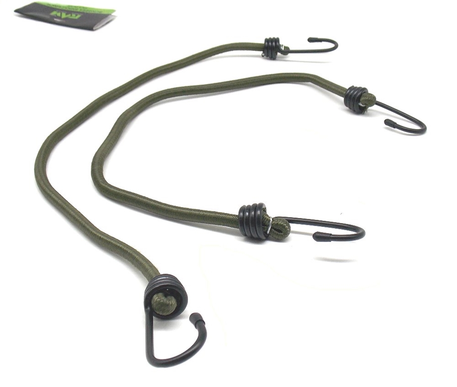 Coppia di corde elastiche con ganci. Lunghezza 60 cm, spessore 8mm. Colore verde. Peso lordo: 172 grammi. Prodotto in P. R. C.