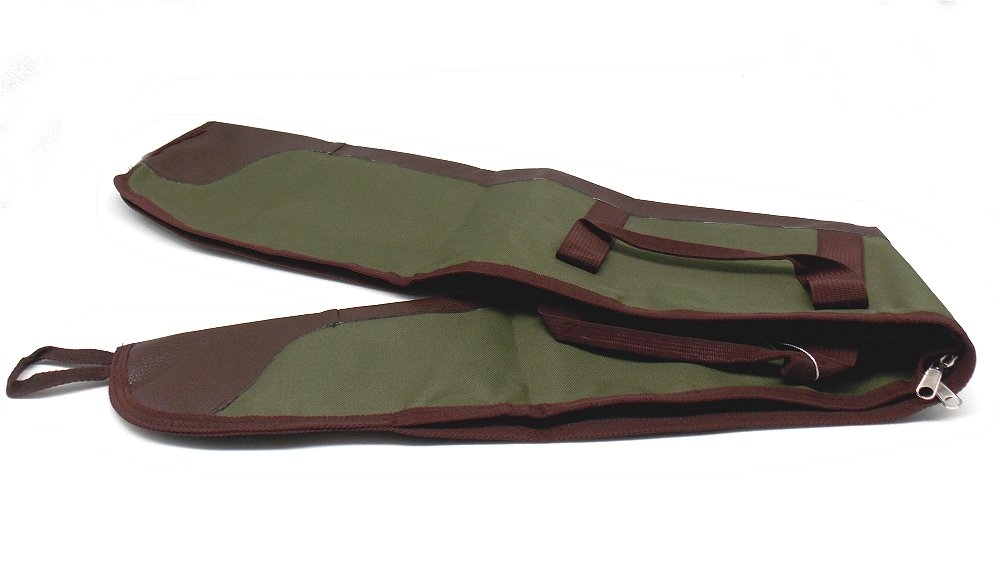 Fodero sfoderato in tela verde con riporti in ecopelle marrone. Apertura con cerniera e manico per il trasporto. Lunghezza 125 cm. Peso lordo: 280 grammi.
