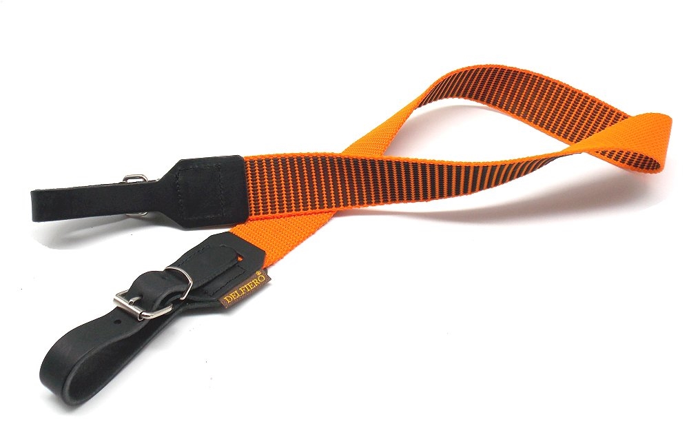 Bretella porta fucile in tela arancione con antiscivolo. Larghezza 4 cm, lunghezza totale 95 cm. Peso lordo: 90 grammi. Attacchi in cuoio. Prodotto in Italia.