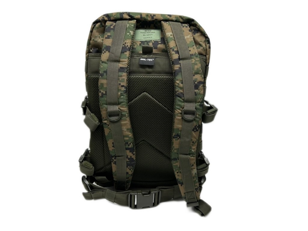 Zaino in poliestere di colore vegetato digitale. Dimensioni: 51x29x28 cm. Peso: 1450 grammi. Capacità: 36 litri. Chiusura con cerniera. Dotato di 2 compartimenti separati e 2 tasche frontali. All'interno ci sono varie tasche. Sul retro c'è un'ampia tasca con chiusura a velcro, ideale per sacche di idratazione. Vari punti di fissaggio molle. Spallacci imbottiti e regolabili. Anelli sugli spallacci. Cinghia sul ventre regolabile con chiusura a sgancio rapido. Maniglia di trasporto. Con cinghie di compressione laterali. Prodotto in Germania. Peso lordo: 1365 grammi.