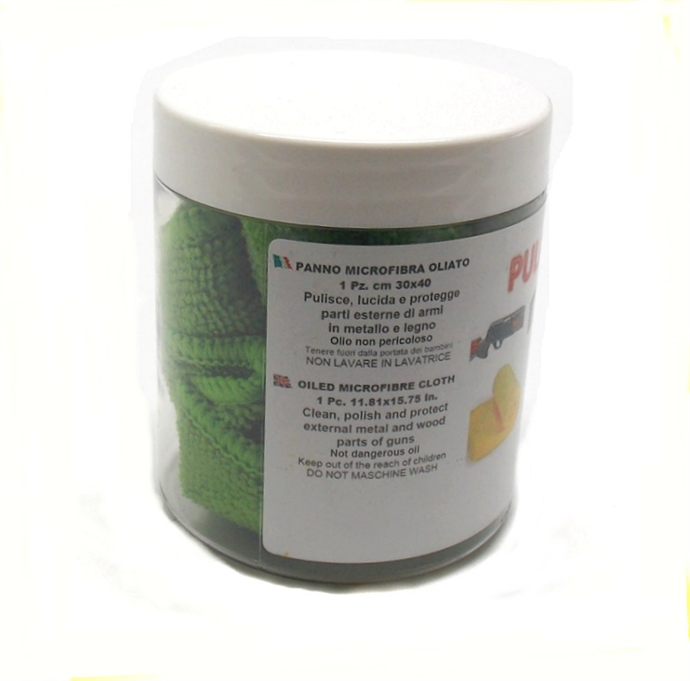 Panno oliato in microfibra per la pulizia, lucidatura e protezione delle armi. Può essere usato su pistole, fucili e carabine.Per mantenere inalterate le sue proprietà si deve conservare nel suo barattolo dopo ogni uso. Misura 30x40 cm. Peso lordo: 80 grammi. Prodotto in Italia.