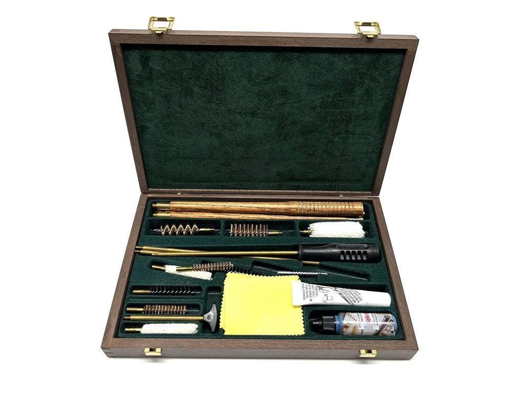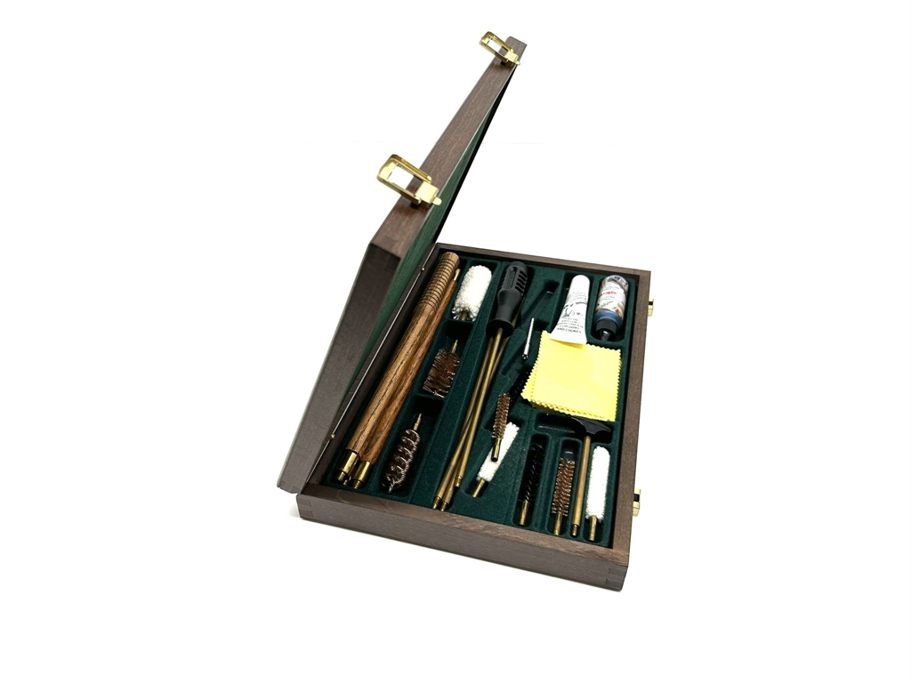 Kit di pulizia per i seguenti calibri: FUCILE: calibro 12. CARABINA: calibri 8 mm/7,62/308/30.03. PISTOLA: 9 mm/38/357. La valigetta contiene un bacchettone in ottone con manico smontabile in tre pezzi, un bacchettone in legno smontabile in tre pezzi, 9 scovoli, tubetto da 25 ml di olio lubrificante protettivo, tubetto da 20 ml di grasso bianco per cerniere e strozzatori, 5 pannetti gialli per la pulizia 6,5x8,5 cm. Dimensioni della valigetta in legno: 32x21x4,2 cm. Peso lordo: 1110 grammi. Prodotto in Italia.
