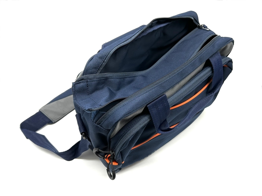 Borsa porta cartucce di colore blu, modello Uniform Pro blu con inserti arancioni, realizzata in materiale idrorepellente e resistente, per contenere fino a 250 cartucce con tre scomparti con tracolla regolabile. Ideale per i campi da tiro. Dimensioni: 25x42x20 cm. Peso lordo: 585 grammi. Doppia impugnatura con velcro chiudibile. Tracolla regolabile e imbottita, ma non rimovibile. Ampia apertura con doppio cursore chiudibile con lucchetto. Tasca frontale con cerniera.