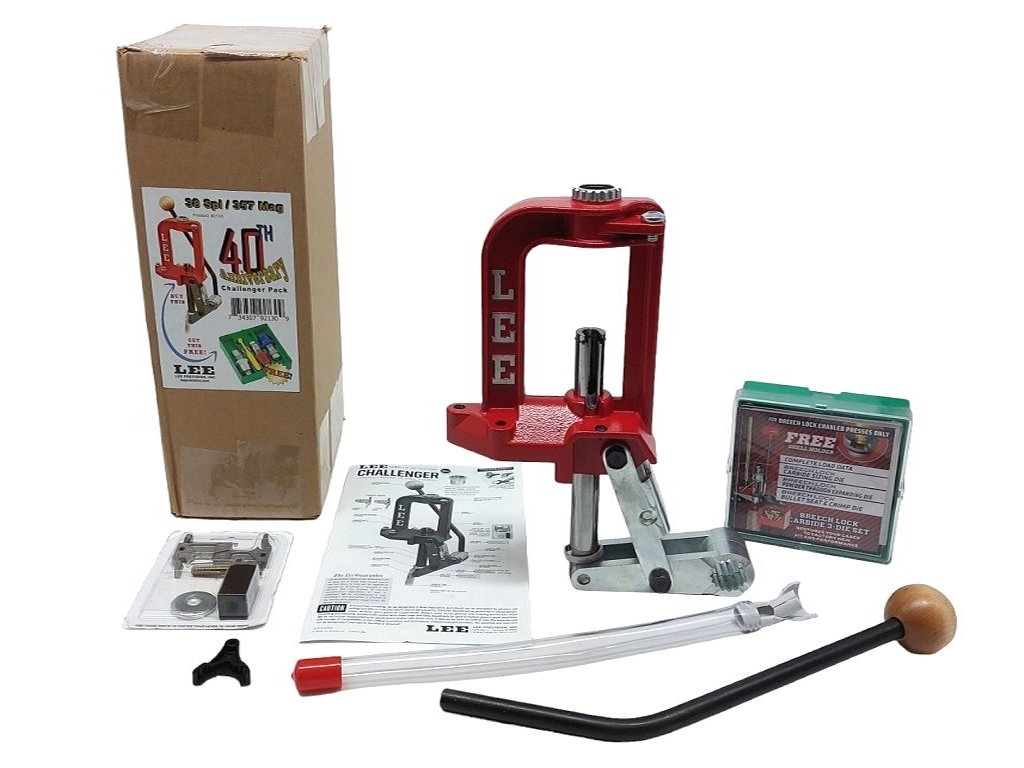 Il Kit per il 40° anniversario della Lee contiene la pressa di ricarica Lee Challenger III e il set di 3 dies in metallo duro 38 special/357 magnum. Il set di 3 die Breech Lock include boccole Smart Lock colorate per una facile identificazione della matrice. Prodotto in Usa. Peso lordo: 3080 grammi.