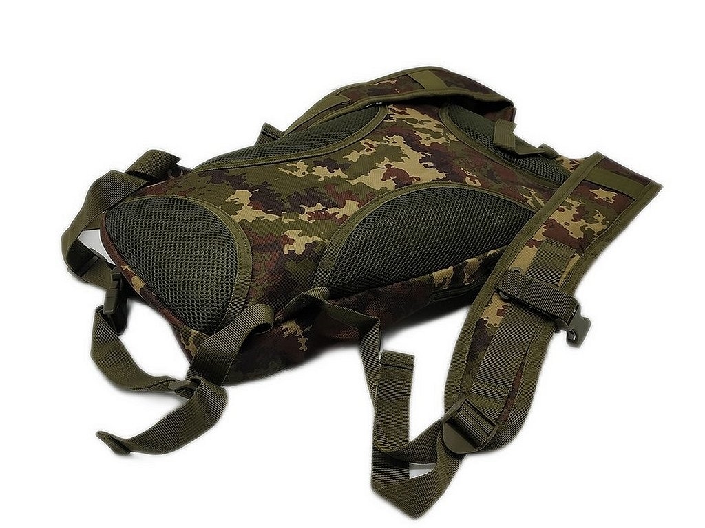 Lo zaino è dotato di un ampio vano con cerniera, sul davanti di tre tasche con cerniera e di una tasca con rete. Spalline imbottite e regolabili. Dimensioni: lunghezza cm 43, larghezza cm 23,5. Capacità circa 14 litri. Peso lordo: 655 grammi