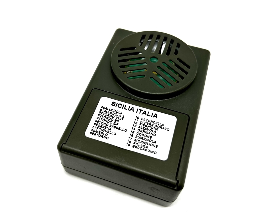 Funzionamento a batteria 9 volt in dotazione. Dotato di due uscite: alimentazione supplementare da 12 v, altoparlante supplementare. Dotato di altoparlante incorporato. Dimensioni: cm 9x6x3. Dotato di custodia in tela con moschettone. Contiene i seguenti canti: 2 canti di allodole, 4 canti di tordi, cesena, finguello, merlo, storno, pavoncella,piviere,fischione,alzavola,germano,codone,marzaiola.moriglione,folaga, beccaccino,fringuello, cardellino,verdone, pispola, frosone, strillozzo, pettirosso, ciuffollotto, lucarino, stornara, colombaccio, coturnice, 4 canti di quaglie, tortora, beccaccia, beccaccino, merlo choch. Non utilizzarlo per più di due ore consecutive. Prodotto in Spagna. Peso lordo: 158 grammi