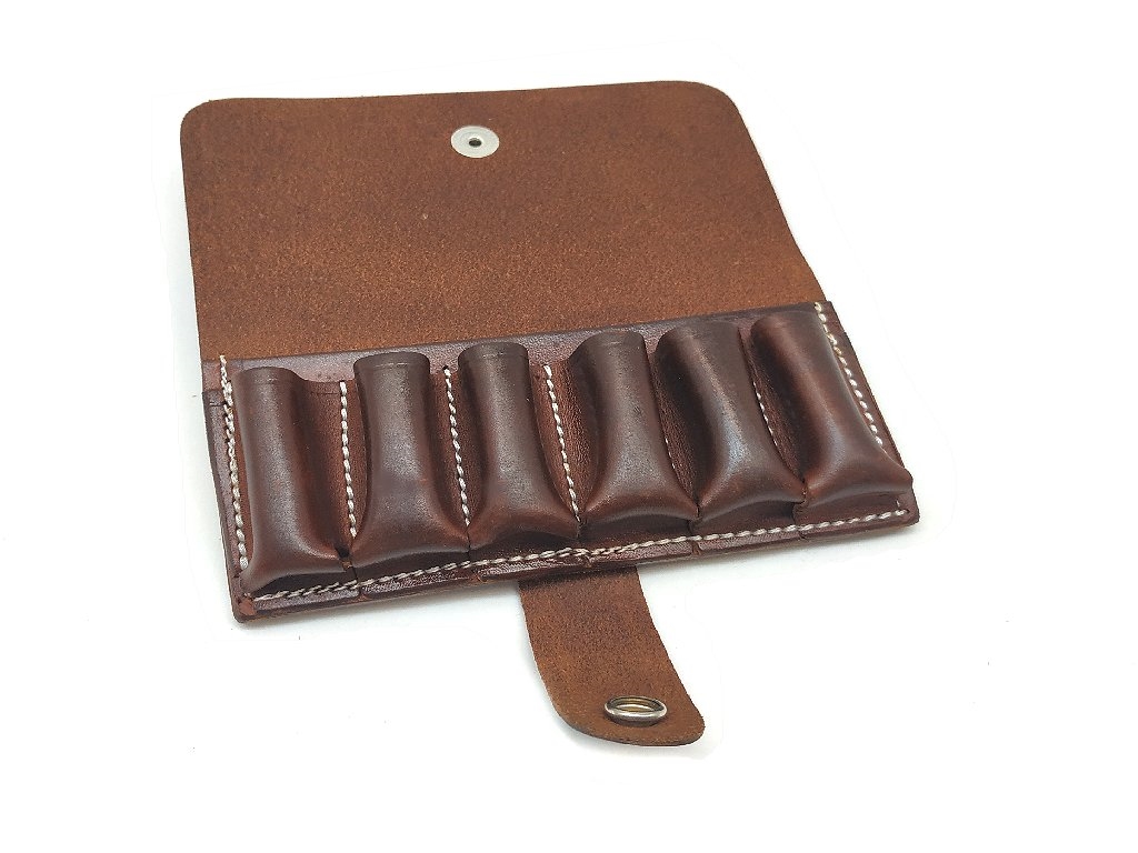 Gibernetta da cintura in pregiato cuoio marrone ingrassato tinta al vegetale , con sei porta cartucce e pattina di chiusura a bottone. Ideale per il porto di cartucce da caccia a palla pert caccia al cinghiale . Disponibili nei calibri 12 e 20. Misura 16x9 cm . Peso lordo : 134 grammi.Made in italy.