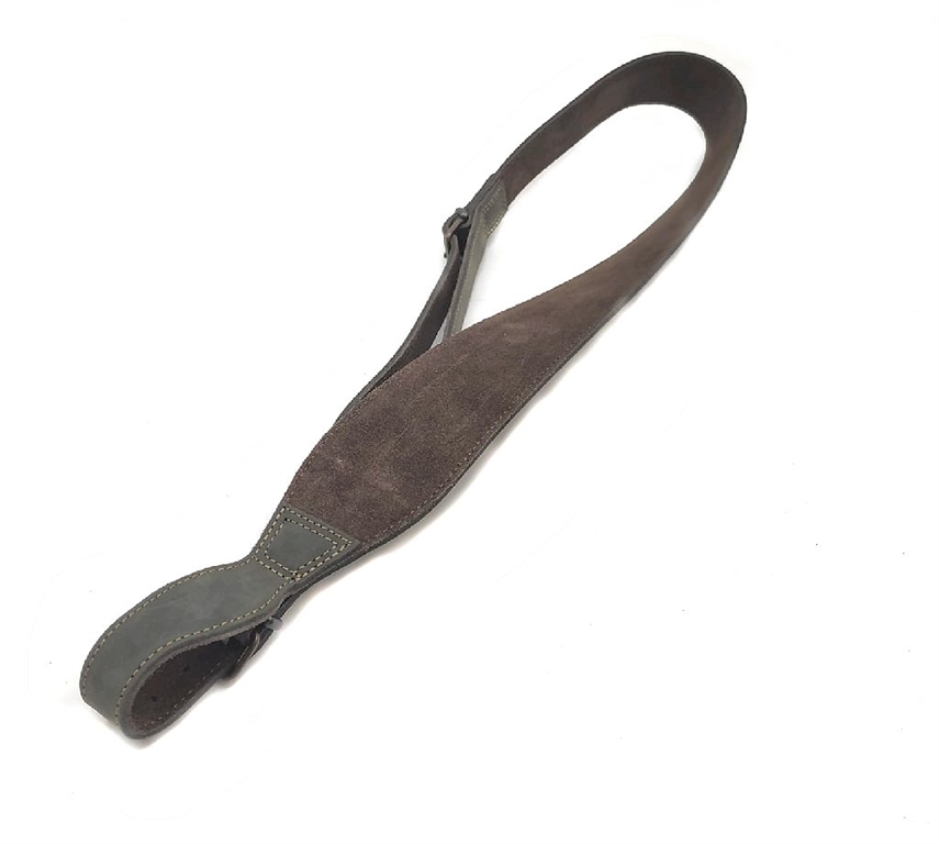 Bretella per carabina in pelle verde idrorepellente ingrassata con effetto nabuk, completamente foderata in pelle scamosciata antiscivolo, cinturini con protezione della fibbia e con robuste cuciture.Lunghezza(a fibbia chiusa al centro fori) cm 93 . Made in italy.