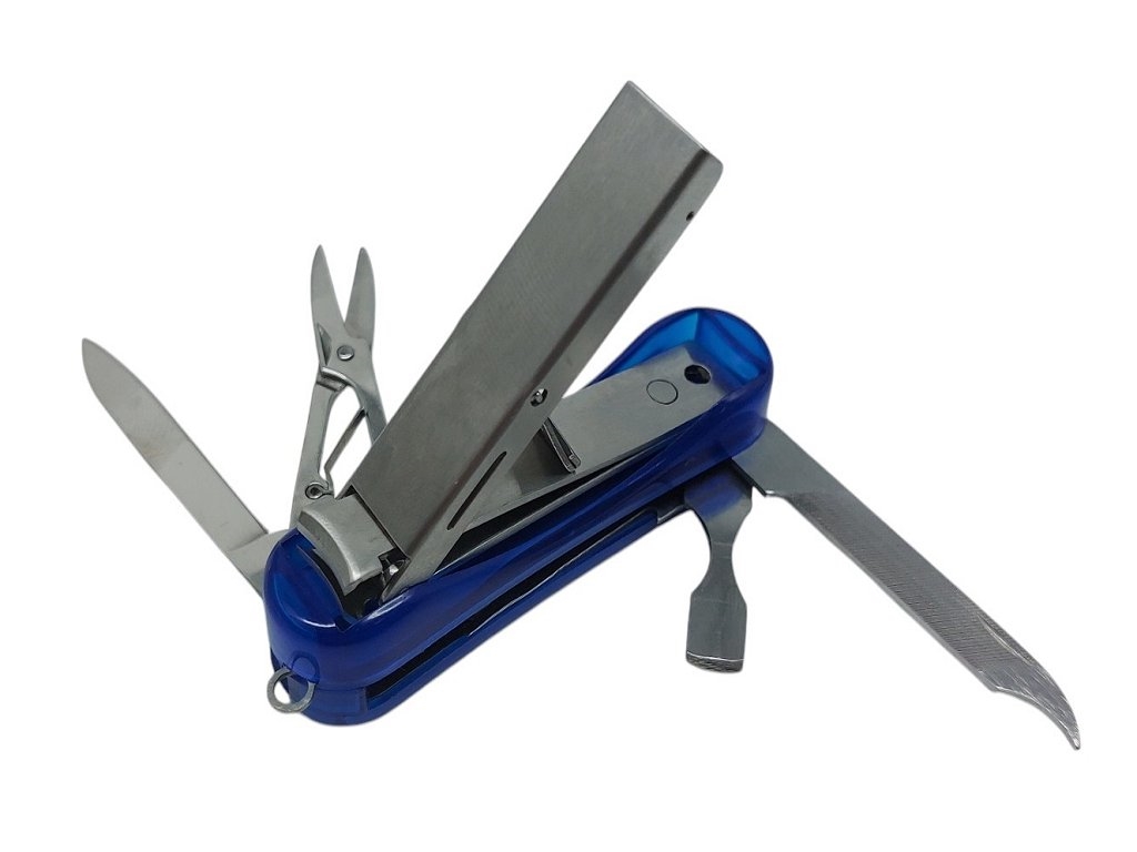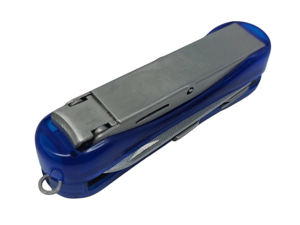 Coltello sportivo. Coltellino multifunzioni: lama, forbici, tagliaunghie, lima, utensili per pulizia orecchio ed unghia. Lame in acciaio inox, guancette in plastica blu. Misure: 6,5x1,50x1,50 cm. Peso lordo: 58 grammi.