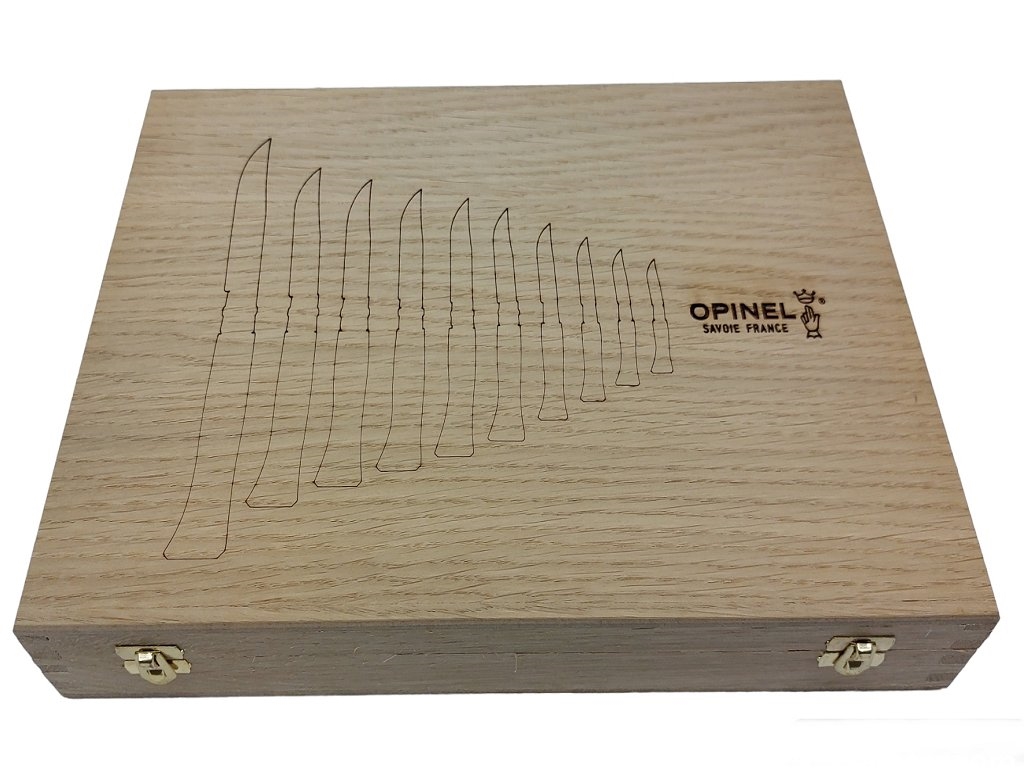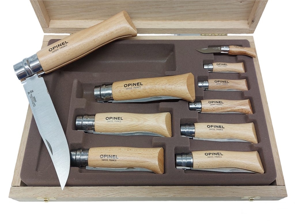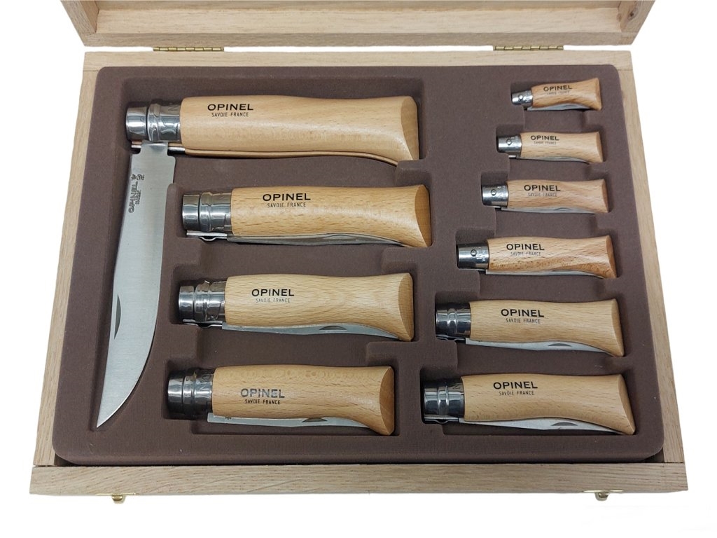 Coltelli sportivi. Set di 10 coltelli opinel di diverse misure. Hanno lama in acciaio inox e manico anatomico in legno chiaro stagionato. Cofanetto cm 31x19,5. Nella confezione sono presenti i seguenti coltelli: n.2 (lunghezza lama 3,5 cm, larghezza lama 0,8 cm, lunghezza totale aperto 8 cm), n.3 (lunghezza lama 4 cm, larghezza lama 1 cm, lunghezza totale aperto 9,5 cm), n.4 (lunghezza lama 5 cm, larghezza lama 1,1 cm, lunghezza totale aperto 11,5 cm), n.5 (lunghezza lama 6 cm, larghezza lama 1,3 cm, lunghezza totale aperto 14 cm), n.6 (lunghezza lama 7 cm, larghezza lama 1,5 cm, lunghezza totale aperto 16,5 cm), n.7 (lunghezza lama 7,8 cm, larghezza lama 1,6 cm, lunghezza totale aperto 18 cm), n.8 (lunghezza lama 8,5 cm, larghezza lama 1,7 cm,lunghezza totale aperto 19 cm), n.8 (lunghezza lama 9 cm, larghezza lama 2 cm, lunghezza totale aperto 21 cm), n.10 (lunghezza lama 10 cm, larghezza lama 2,2 cm, lunghezza totale aperto 23 cm), n.12 (lunghezza lama 12 cm,larghezza lama 2,5 cm, lunghezza totale aperto 28 cm). Prodotto in Francia. peso lordo: 1142 grammi.