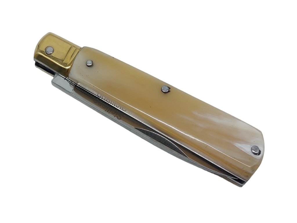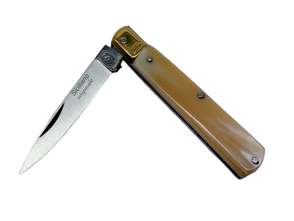 Coltello sportivo. Lunghezza totale aperto 17 cm. Lama in acciaio AISI 420 J2. Questo particolare coltello presenta una doppia caratteristica che lo rende coltello da lavoro e da collezione : il manico in corno biondo di bue risulta essere diverso ed unico in quanto le venature e i colori chiari o scuri sono diversi . La lama in acciaio inox a specchio risulta essere particolarmente tagliente e resistente. Prodotto in Italia. Peso lordo: 64 grammi.