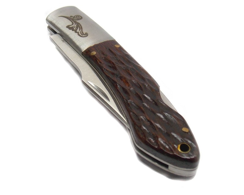 Coltello sportivo. Lunghezza lama 7 cm, larghezza lama massima 1,6 cm, lunghezza totale aperto 17,2 cm. Lama in acciaio, manico in osso. Dotato di blocco lama. Sulla lama incisione laser: arance e arancini di sicilia e disegno barocco sulla testina. Nel ricordo del barocco della splendida val di noto il coltello usato per munnare le arance di sicilia, ricorda anche ai golosi dei mangiari siciliani, le buonissime arancine di questa zona della Sicilia. Peso lordo: 90 grammi.
