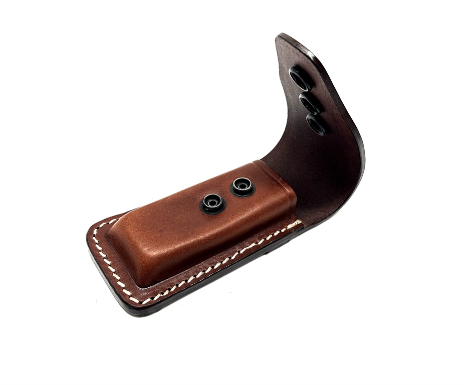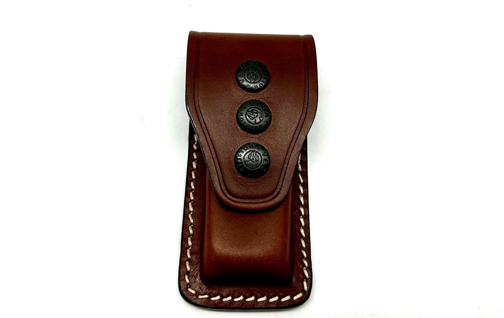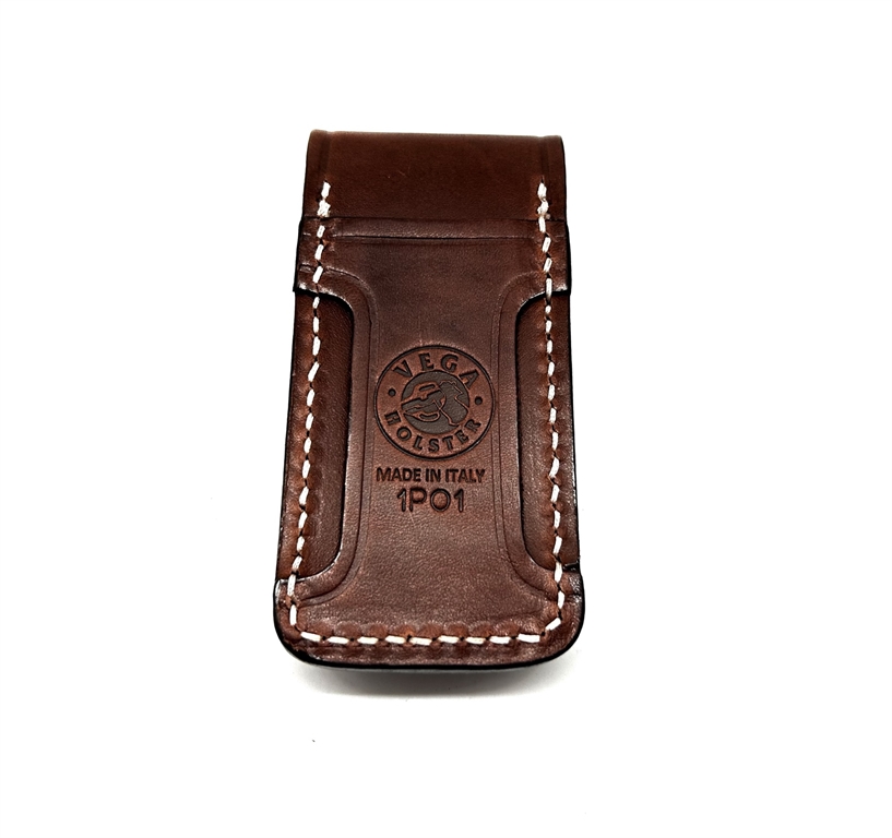 Dimensioni: lunghezza utilizzabile da 10 a 13 cm, larghezza utilizzabile 3,5 cm interno 2 cm. Chiusura pattina con doppio bottone a pressione che permette di regolare l'altezza in base alla misura del coltello. Dietro passante per cinture larghe fino a 5 cm, con apertura e chiusura tramite bottone a pressione. Realizzato in cuoio fiore di prima scelta. Disponibili nei colori: nero e marrone. Peso lordo: 78 grammi. Prodotto in Italia.