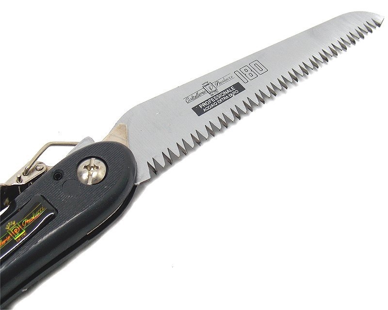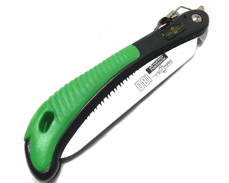 Foldable pruning saw, stainless steel blade. Blade length 18 cm, total length when open 39 cm. Rubber handle with blade lock. Gross weight: 210 grams.