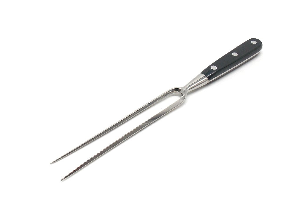 Forchettone da cucina in acciaio inox forgiato di altissima qualita con finitura lucida e manico in polimero nero con rivetti inox. Lunghezza totale 29 cm. Prodotto in Italia. Peso lordo: 148 grammi.