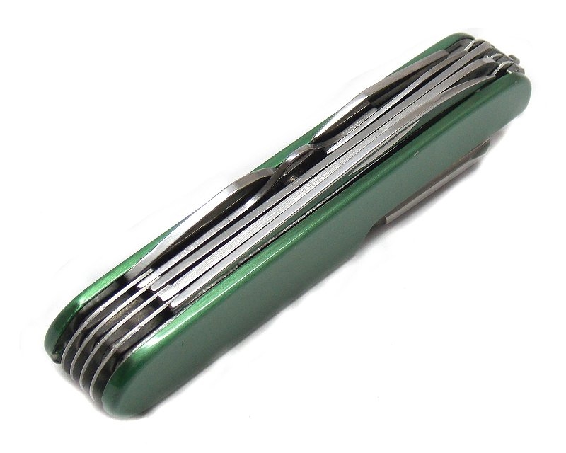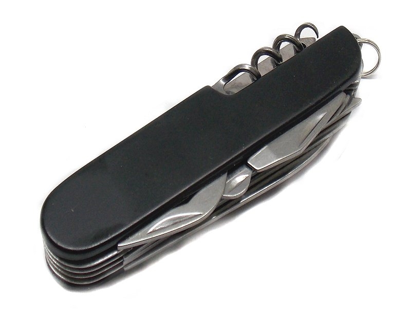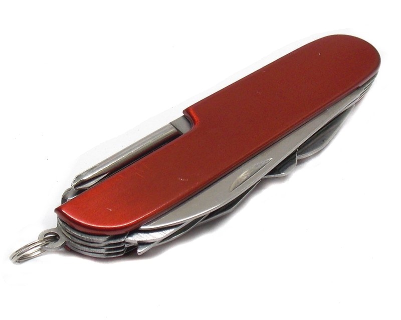 Coltello sportivo. Lunghezza lama 5,5 cm, larghezza lama 1,3 cm, lunghezza totale aperto 15 cm. Lunghezza chiuso 9 cm. Dotato di varie funzioni: coltello, seghetto, forbicine, giravite, apribottiglie, ecc. Manico in metallo colorato, i cui colori disponibili sono: rosso, verde, nero, blu. Peso lordo: 95 grammi.