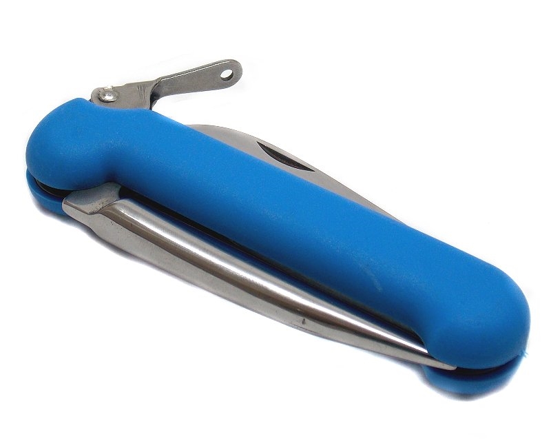 Coltello sportivo. Lunghezza lama 6,5 cm, larghezza lama 1,7 cm, lunghezza totale aperto 18 cm (con punteruolo lunghezza totale 26,5 cm). Lama in acciaio inossidabile, manico in gomma blu. Dotato di blocco lama e cavigliera. Prodotto in Italia. Peso lordo: 130 grammi.