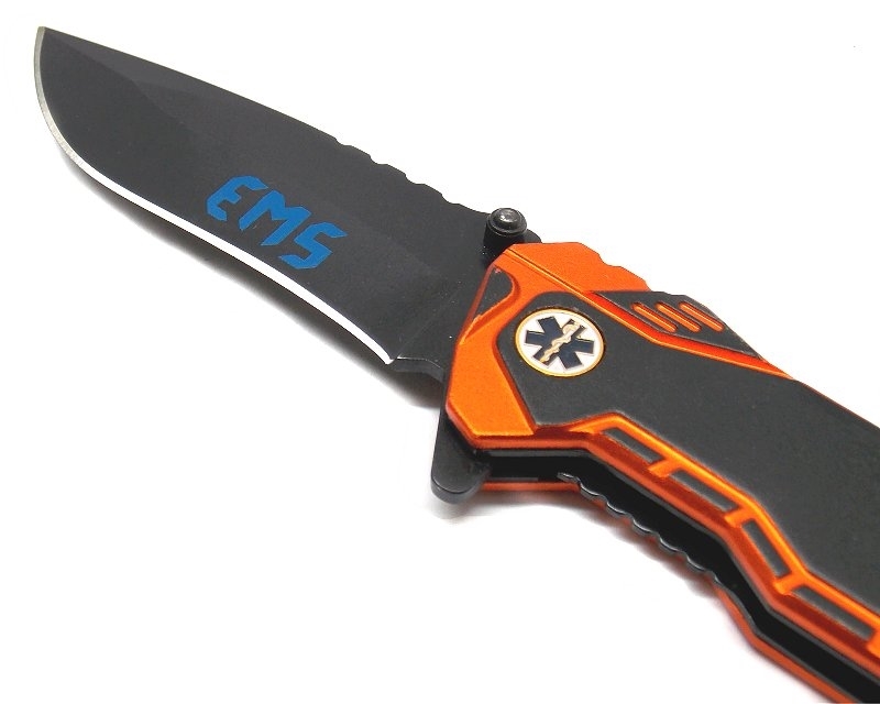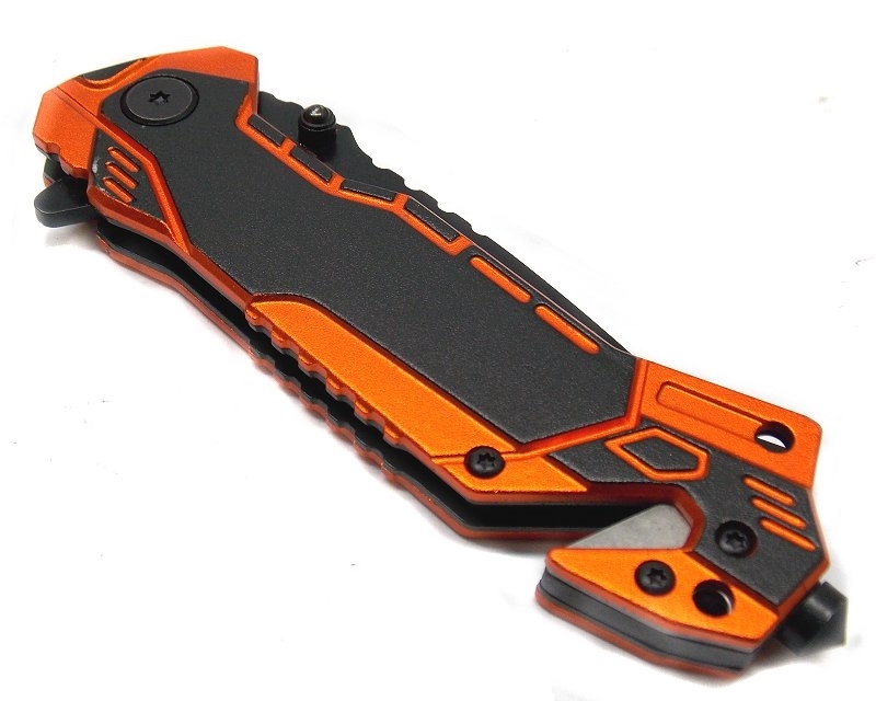 Coltello da soccorso. Lunghezza lama 8,5 cm, larghezza lama massima 3 cm, lunghezza totale aperto 20,5 cm. Dotato di fodero in tela nera con passante per cinturoni alti 7 cm., di blocco lama, di rompivetro e di taglia cintura. Lama in acciaio nero. Manico gommato antiscivolo. Con clip per metterlo al cinto. Peso lordo: 207 grammi