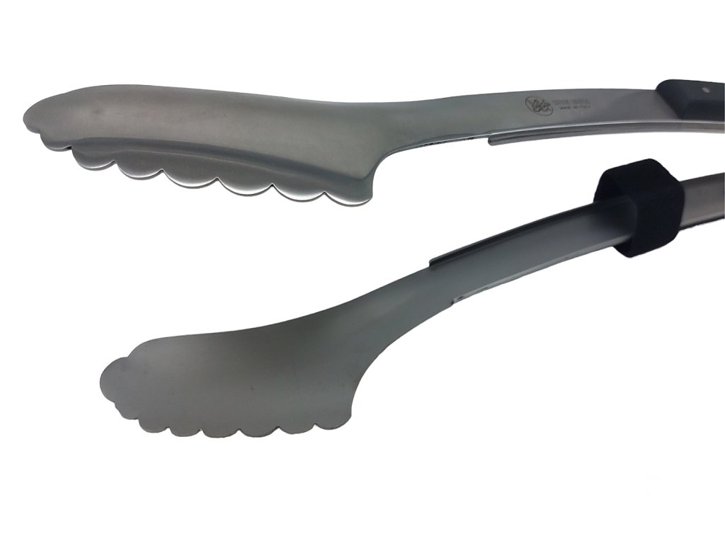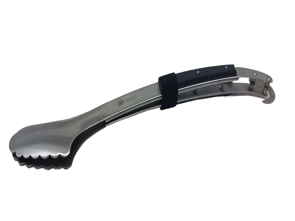 Pinza da Barbercue Due Buoi in acciaio inossidabile temprato con il manico in polimero nero. Solida struttura lunga 48 cm, in grado di spostare grossi pezzi di carne, è dotata di un comodo gancio che offre anche un punto per una comoda base di appoggio. Prodotto in Italia. Peso lordo: 450 grammi.