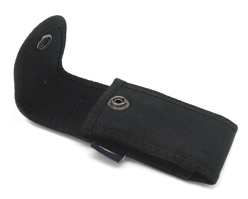 Fodero in nylon nero con passante cintura alto 7 cm. Chiusura con bottone a pressione. Lunghezza 13 cm, larghezza 4,5 cm. Peso lordo: 29 grammi.