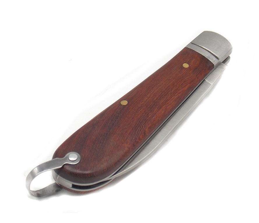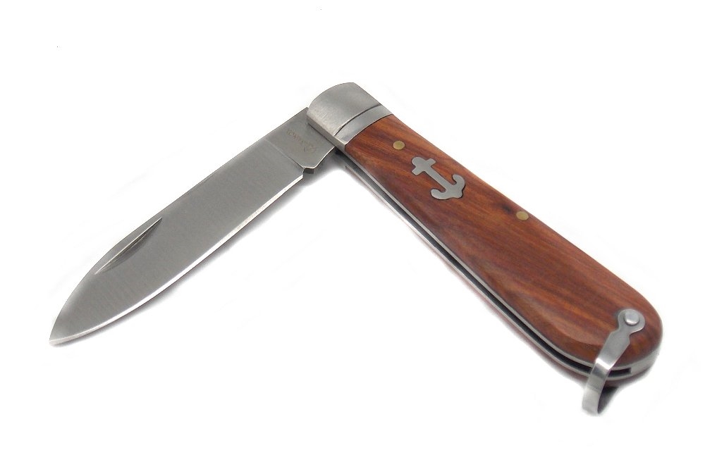 Coltello sportivo. Lunghezza lama 7 cm, larghezza lama 1,2 cm, lunghezza totale aperto 17,5 cm. Manico in legno con inserto ancora. Con anellino. Peso lordo: 92 grammi