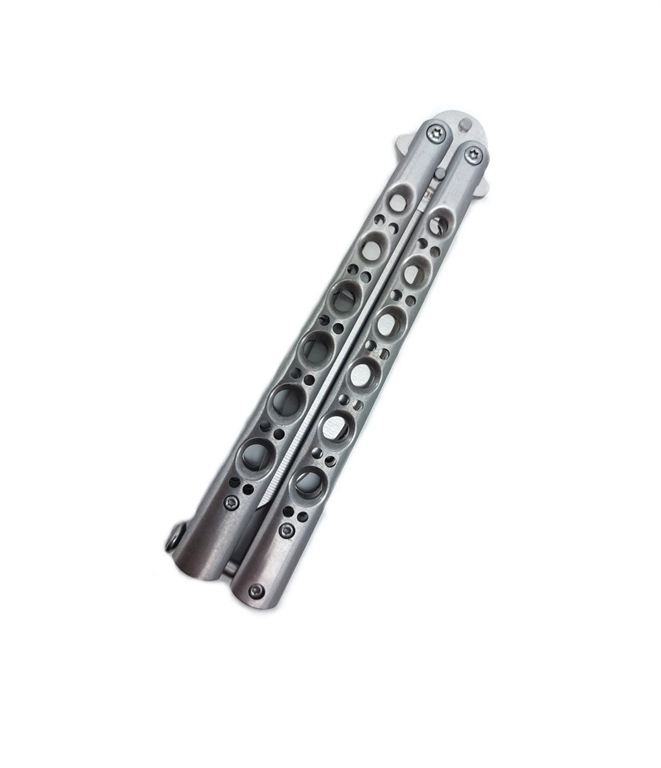 Coltello Butterfly in acciaio inox manico forato , Lunghezza totale aperto cm. 24.Lunghezza totale chiuso cm. 14. Peso lordo: 140 grammi