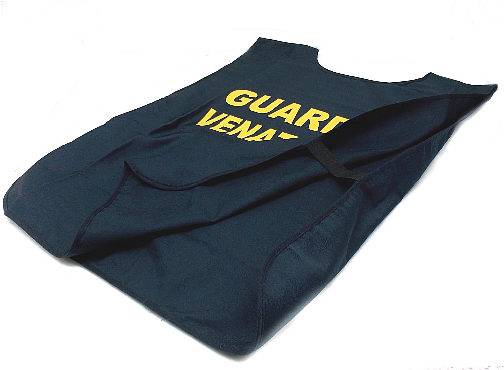 Corpetto in cotone blu aperto lateralmente, con elastici a strip regolabili. Misura unica. Scritta davanti e dietro. Dimensioni: 69x52 cm. Peso lordo: 190 grammi.