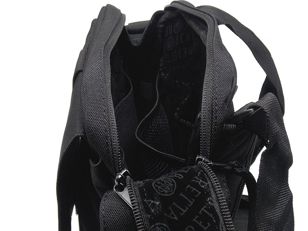 Borsa in nylon nero. Ampio vano interno imbottito con due tasche. Un ampia tasca sul davanti che si chiude con pattina e strip. Due tasche laterali espandibili tramite cerniera. Tracolla regolabile. Altezza 29 cm, larghezza 26 cm. Peso lordo: 800 grammi.