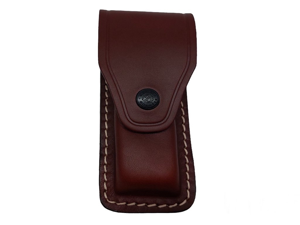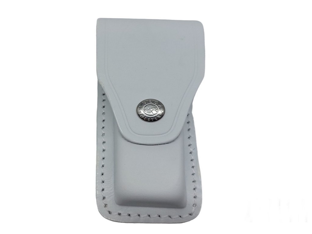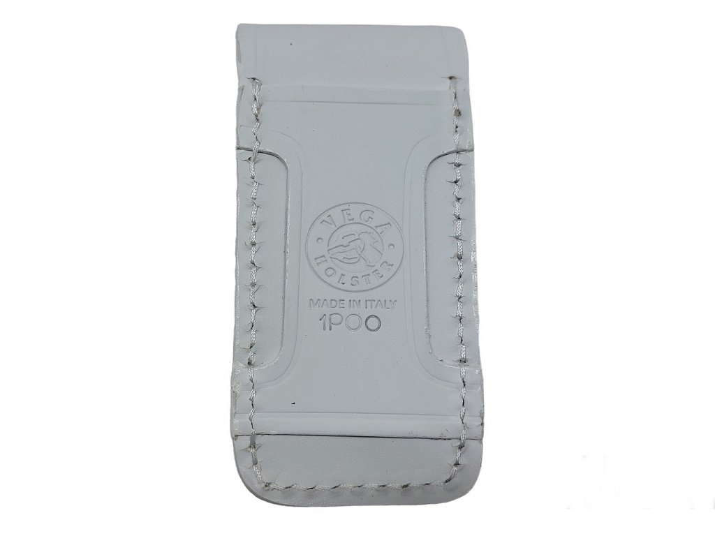 Porta caricatore bifilare in cuoio. Doppio bottone. Colori disponibili: bianco, nero e marrone. Possibilità di portarlo verticalmente oppure orizzontalmente. Per il porto verticale il passante dietro cucito è per cinturoni fino a 5 cm di altezza. Per il porto orizzontale il passante dietro cucito è per cinturoni fino a 4 cm di altezza. Misure: lunghezza utilizzabile da 12,5 cm a 14 cm, larghezza interna 3,5 cm, ampiezza interna 2,8 cm. Peso lordo: 80 grammi. Prodotto in Italia.