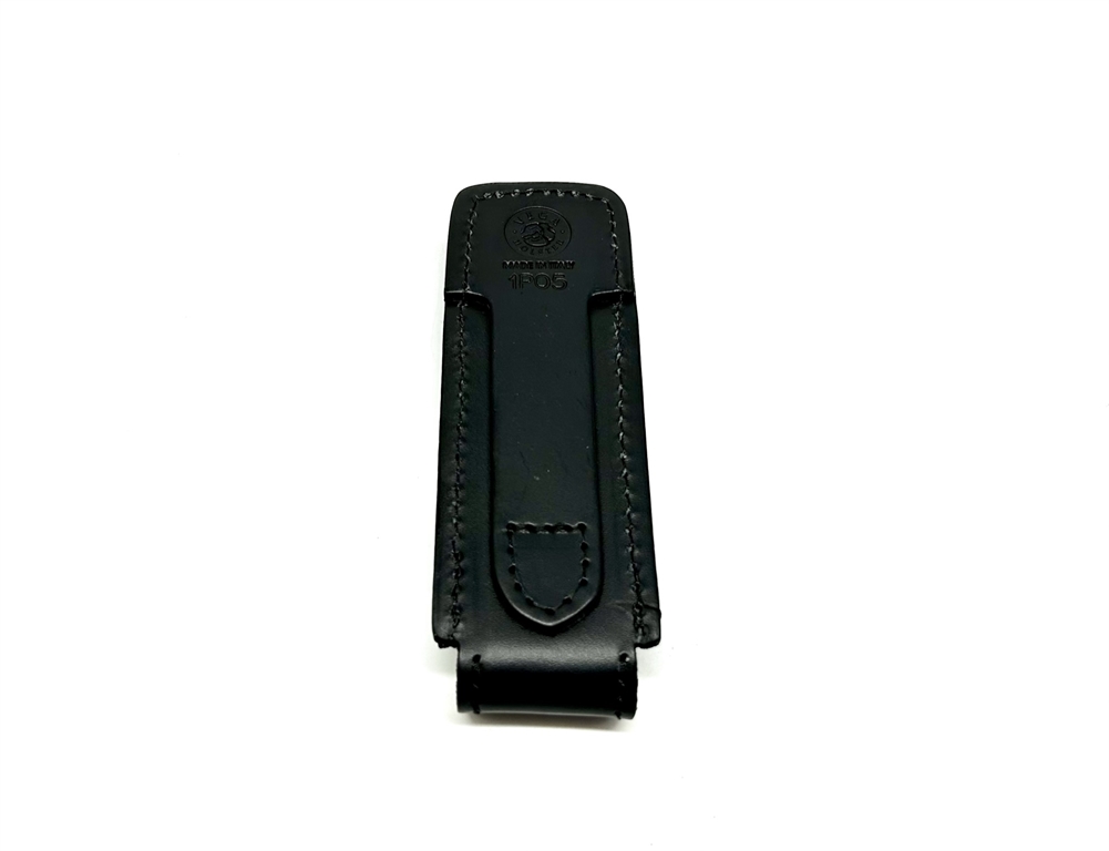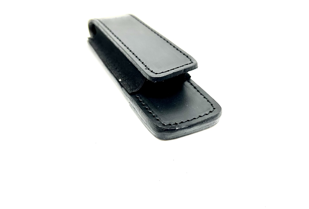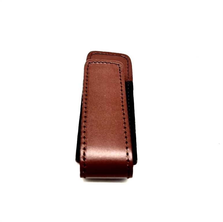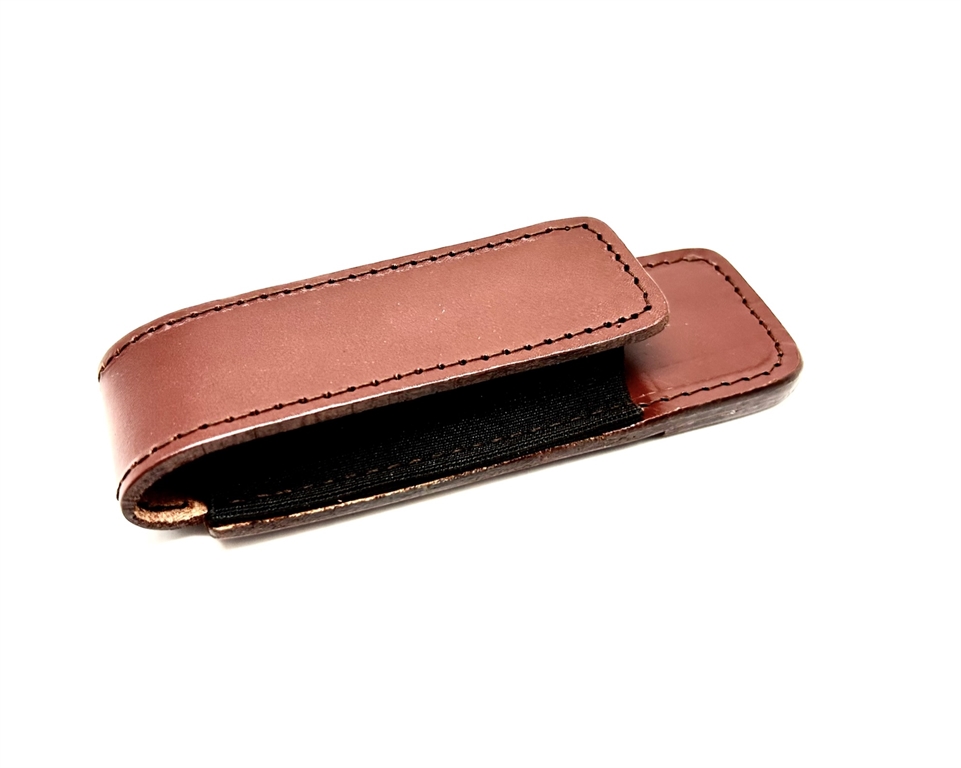 Porta caricatore aperto in cuoio con elastico laterale per cinturoni. Colori disponibili: nero e marrone. Peso lordo: 44 grammi. Prodotto in Italia.