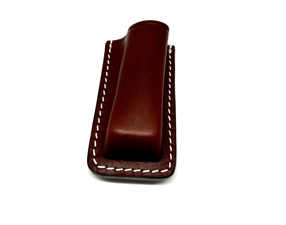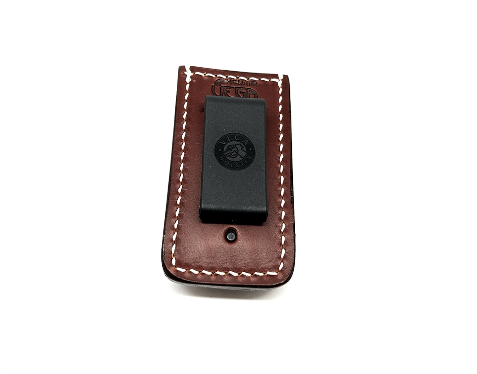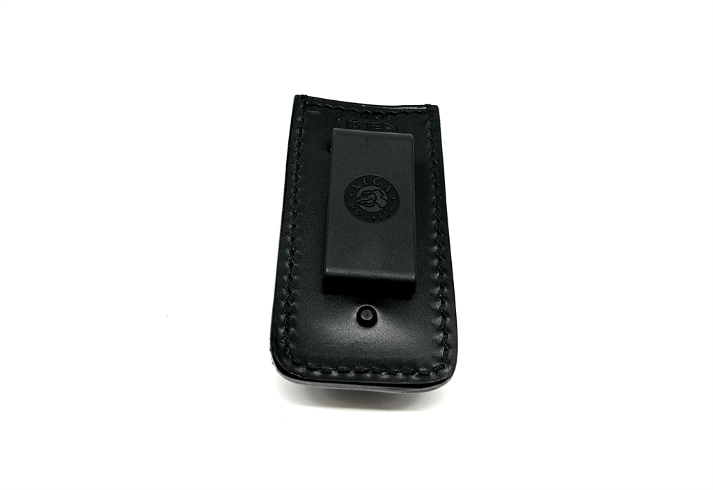 Dimensioni: lunghezza 11,5 cm, larghezza 6 cm, passante per cintura altezza 6 cm. Per caricatori bifilari. Disponibile in cuoio nero o marrone. Peso lordo: 62 grammi. Prodotto in Italia.