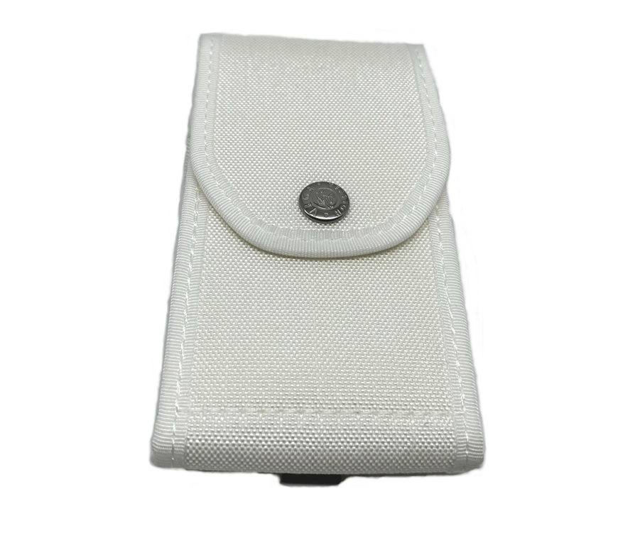 Porta caricatore doppio. Dimensioni: lunghezza 15 cm, larghezza 8 cm. Passante per cintura apribile altezza 7 cm. Colori disponibili: nero, verde, blu, bianco. Peso lordo: 55 grammi. Prodotto in Italia.