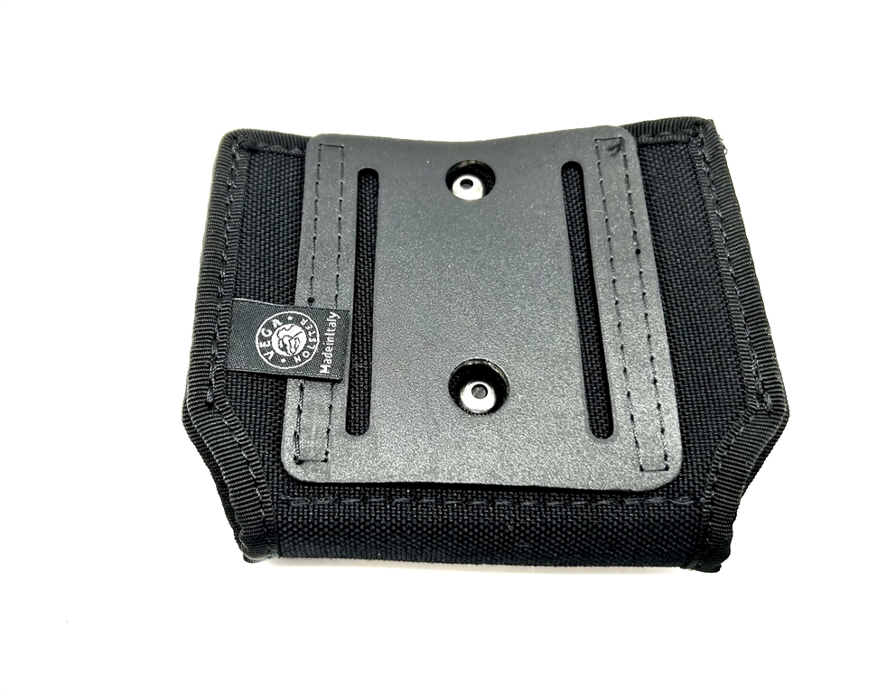Porta caricatore doppio aperto in cordura nera con passante in polimero. 2 posizioni orizzontale o verticale dimensioni: lunghezza 10 cm, larghezza 12 cm. Passante per cinturoni alti massimo 6,5 cm. Peso lordo: 70 grammi. Prodotto in Italia.