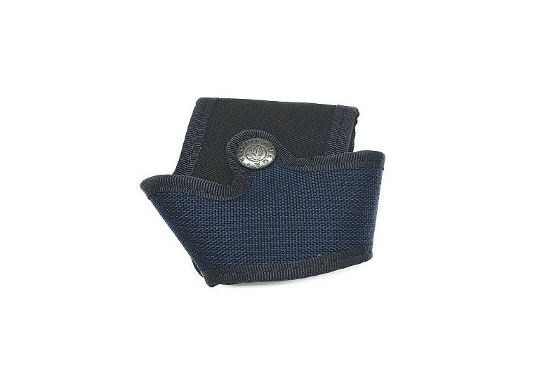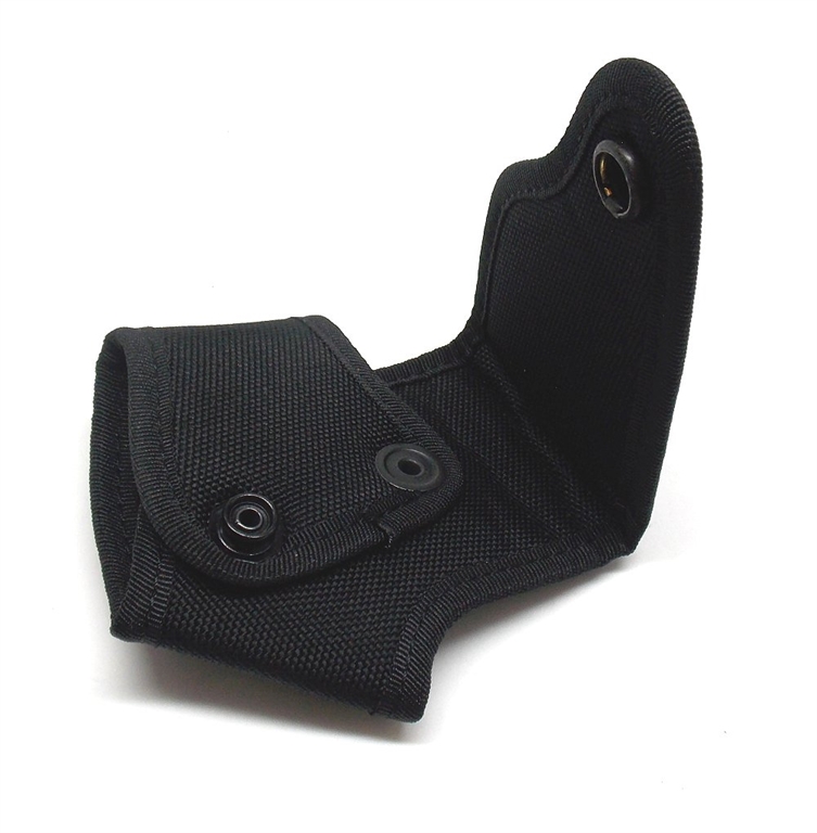 Porta manette in cordura con passante con bottone di sicurezza. Colori disponibili: blu, nero, bianco o verde. Dimensioni: lunghezza 8,5 cm, larghezza massima 9,5 cm, altezza cinturone massima 5,5 cm. Peso lordo: 40 grammi. Prodotto in Italia.