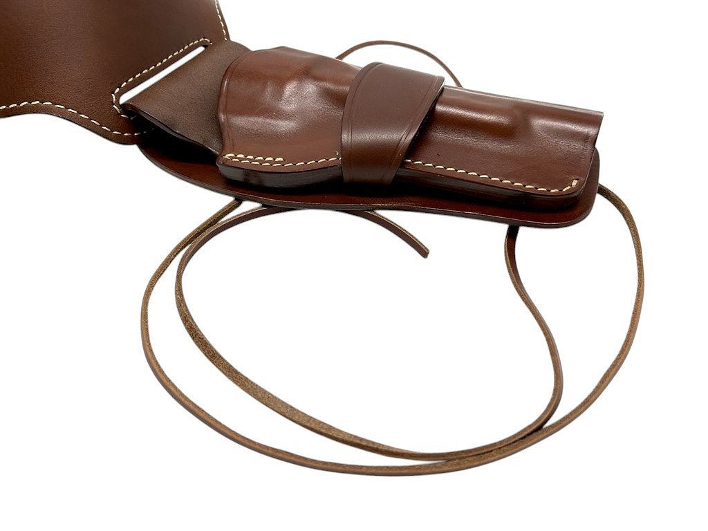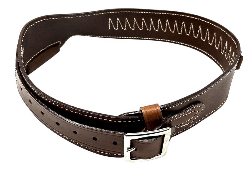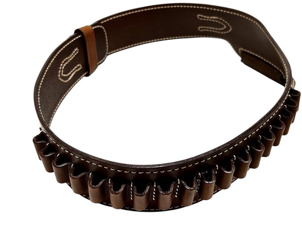 Cinturone in cuoio largo 7 cm con 18 celle compatibili per calibri 38 special/357 magnum, 44 e 45, e fondina far west per revolver singola azione da 6,5 pollici. Misure disponibili: M=89/103 cm, L=101/115 cm, XL=113/127 cm. Colore marrone. Peso lordo: 755 grammi. Prodotto in Italia.