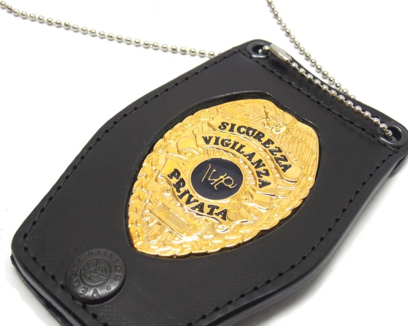 Porta placca in pelle da collo e cintura con placca sicurezza. Dimensioni: lunghezza 12 cm, larghezza 8 cm. Dotato di retro passante in cuoio apribile per cintura. Peso lordo: 85 grammi. Prodotto in Italia.